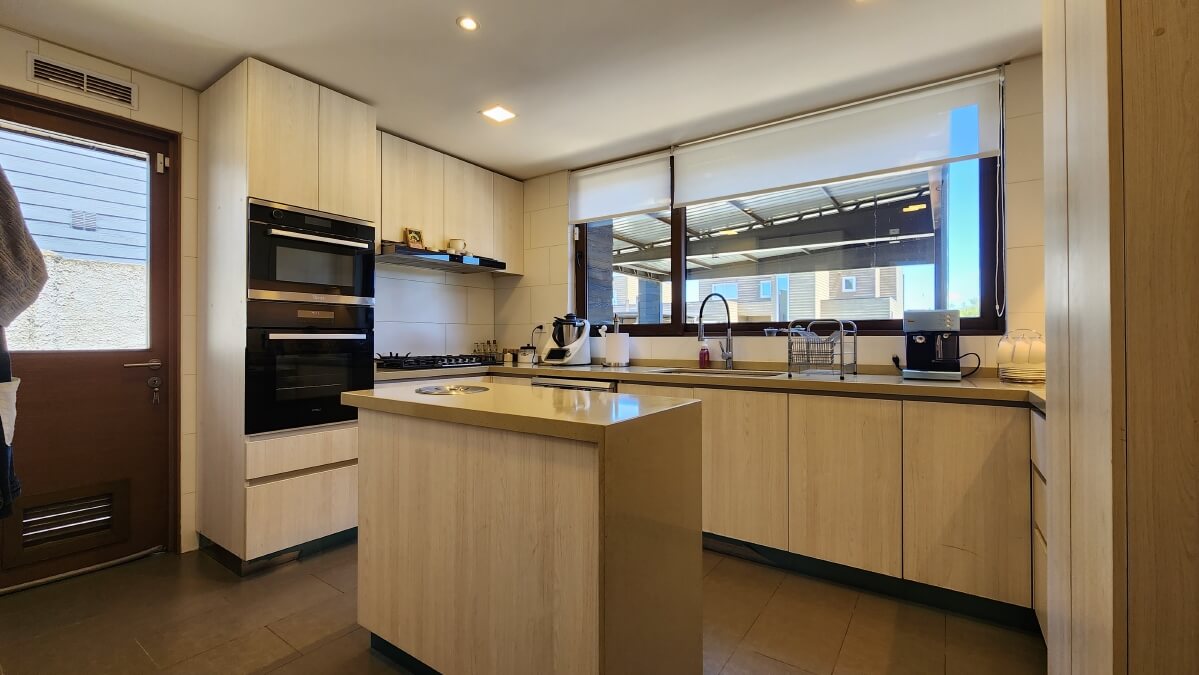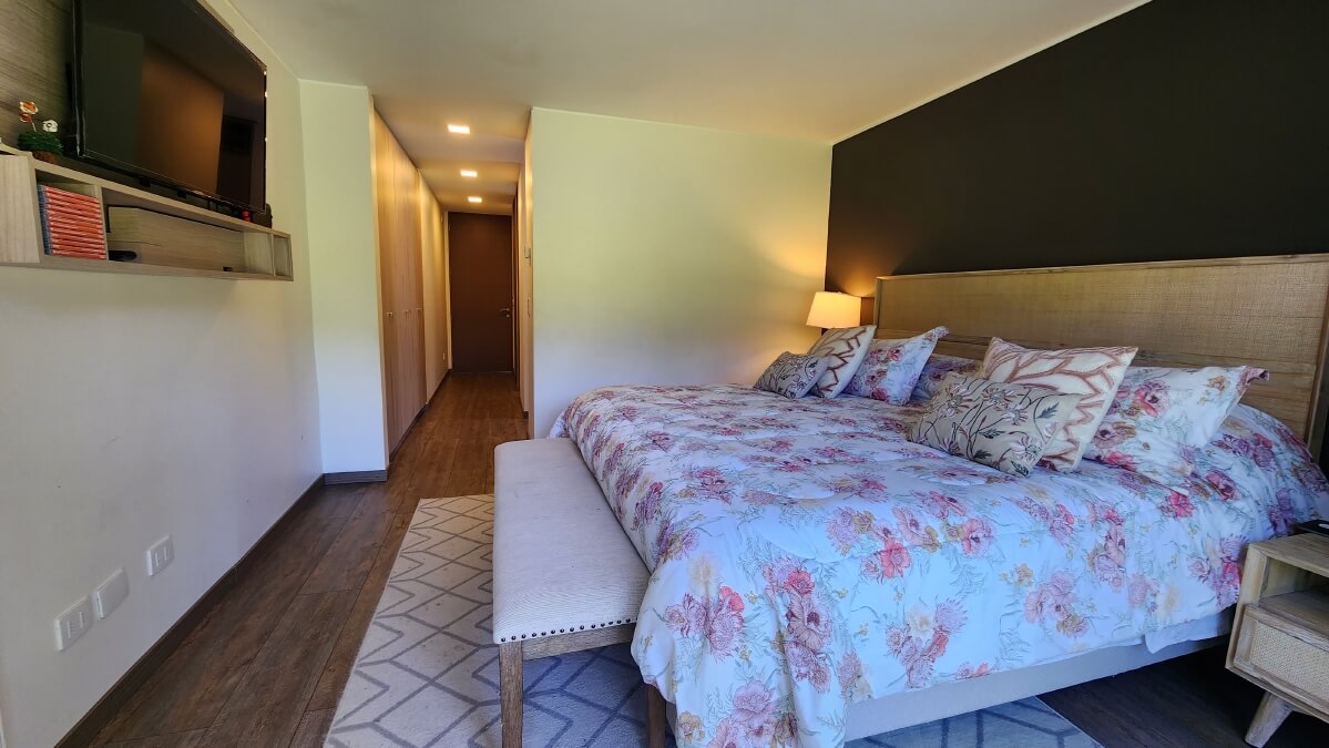 Primer Piso: Hall de acceso en doble altura con grandes cristales y un exclusivo acabadado de maderas, baño completo para visitas, amplio living con exclusivo y divertido bar, y comedor con grandes ventanales para salir a la terraza cerrada, con zona de quincho equipado, escritorio privado o dormitorio de guagua, gran dormitorio principal con elegante sala de baño con áreas privadas de wc y ducha, junto al vanitorio doble, moderno y amplio walkin closet, cuenta además con grandes ventanales con salida a la terraza privada. Moderna y elegante Cocina equipada y amoblada con isla, comedor de diario, gran logia (Lavadero), baño de servicio, patio de servicios, estacionamiento cerrado para 2 vehículos con portón automático.