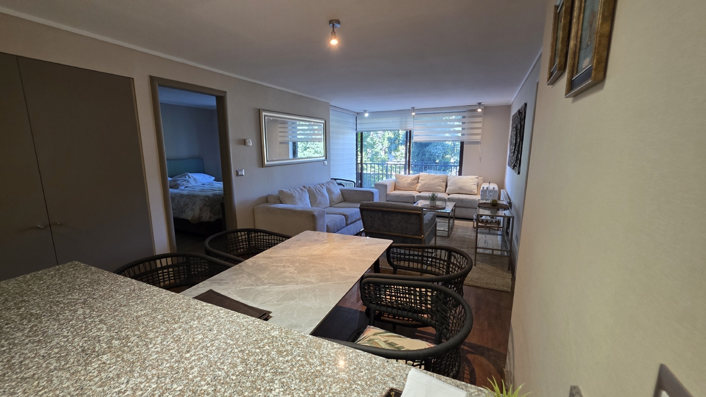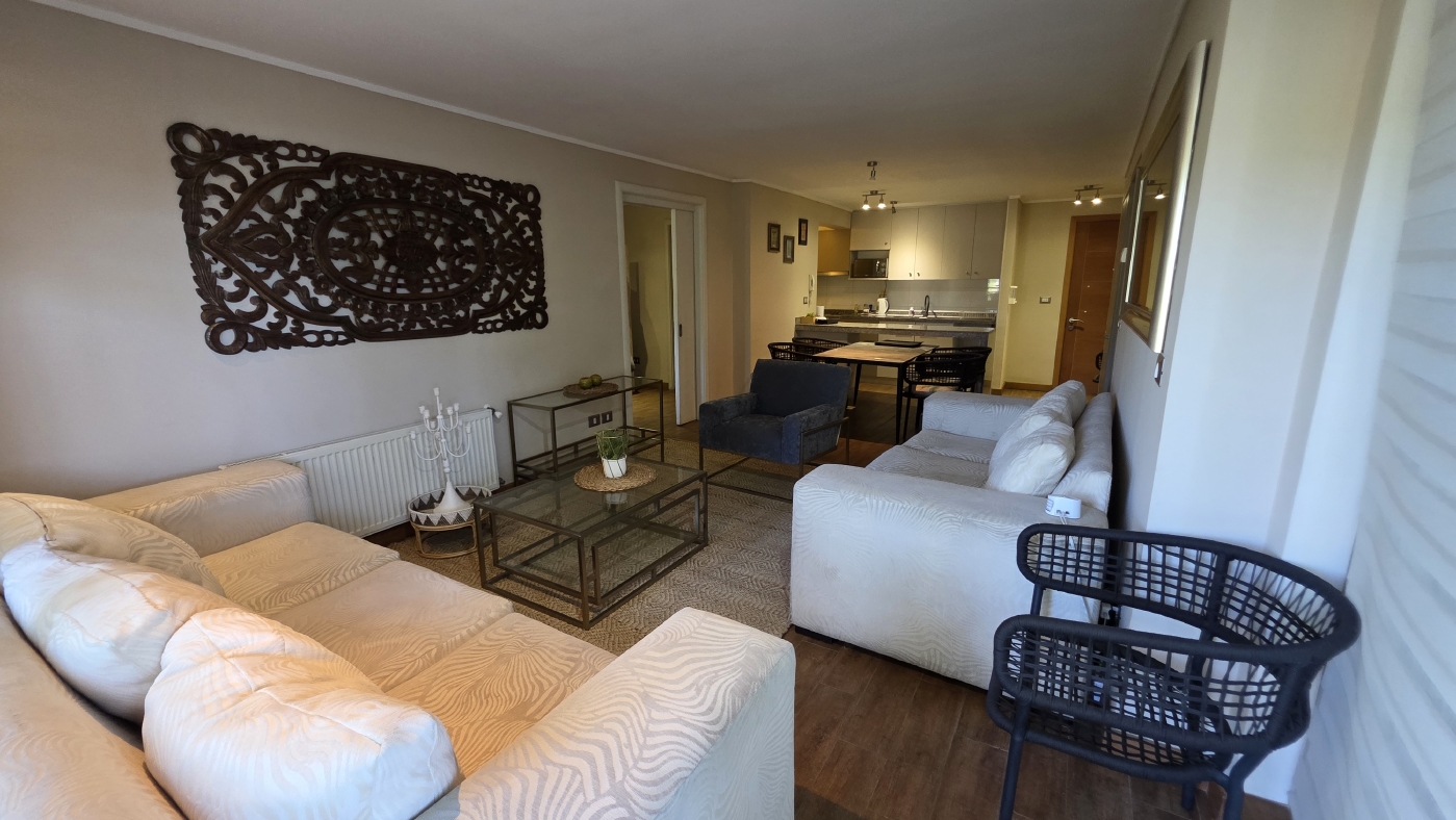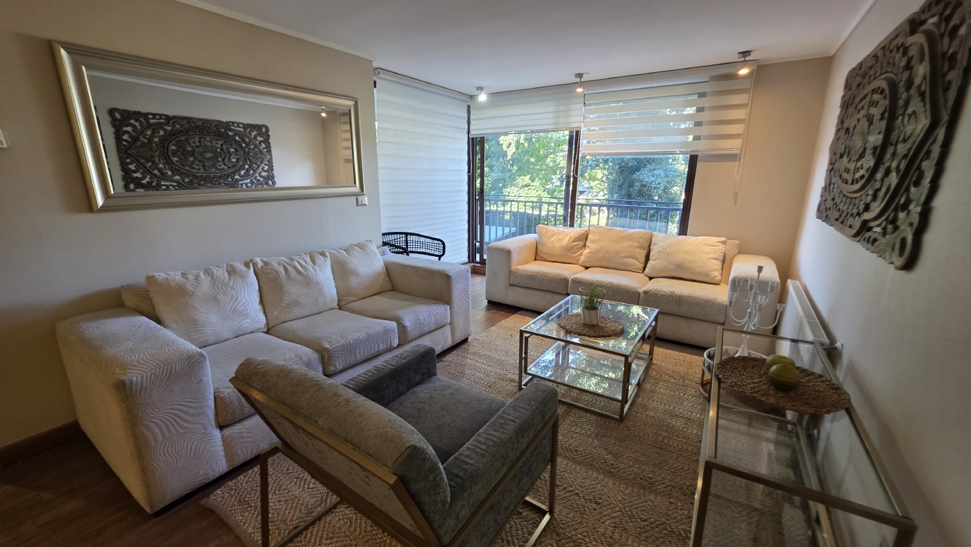 Cuenta con 85 m2 totales, los cuales tienen la siguiente distribución: Acceso al amplio Living comedor con cocina incorporada y mesón de apoyo, amplia terraza panorámica con vista al parque colindante, practica sala de estar con un baño completo y un cómodo dormitorio, luego el amplio dormitorio principal en suite con walking closet. Todos los recintos con calefacción central.