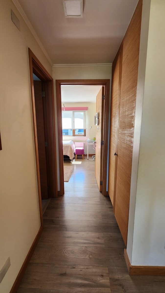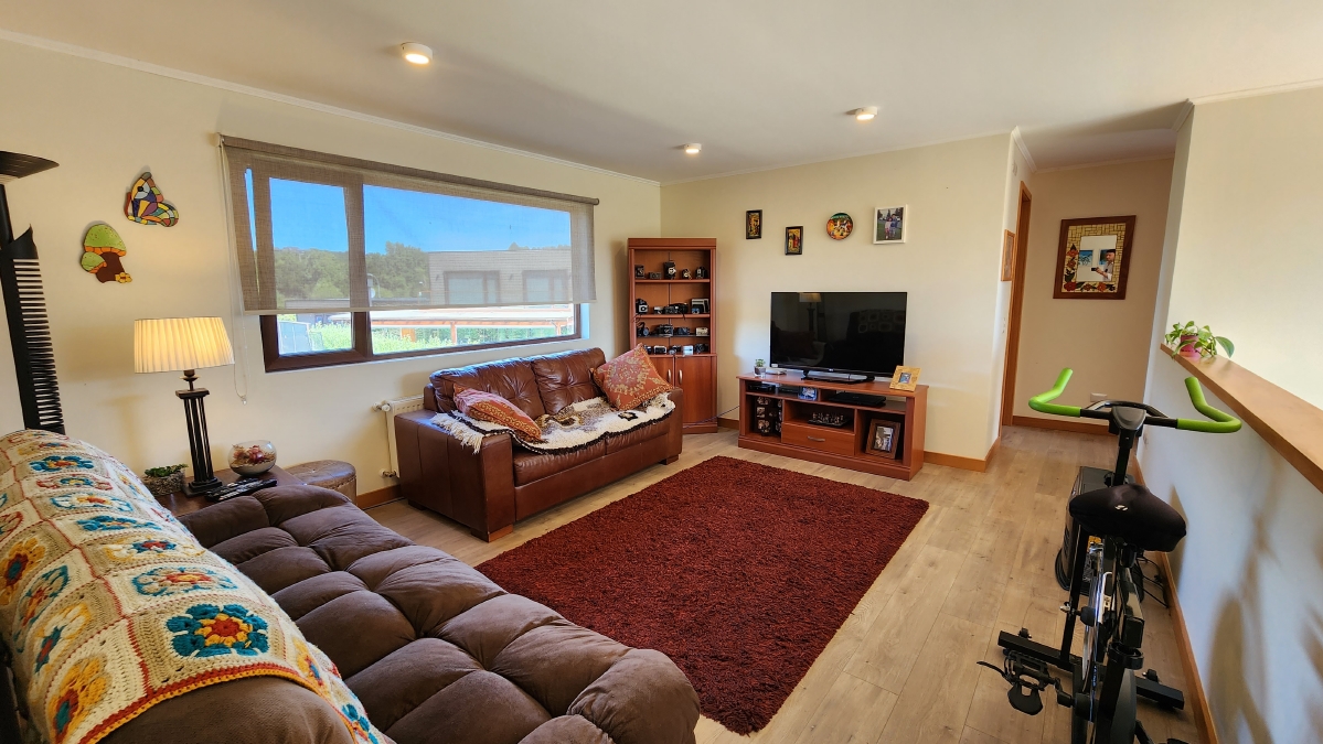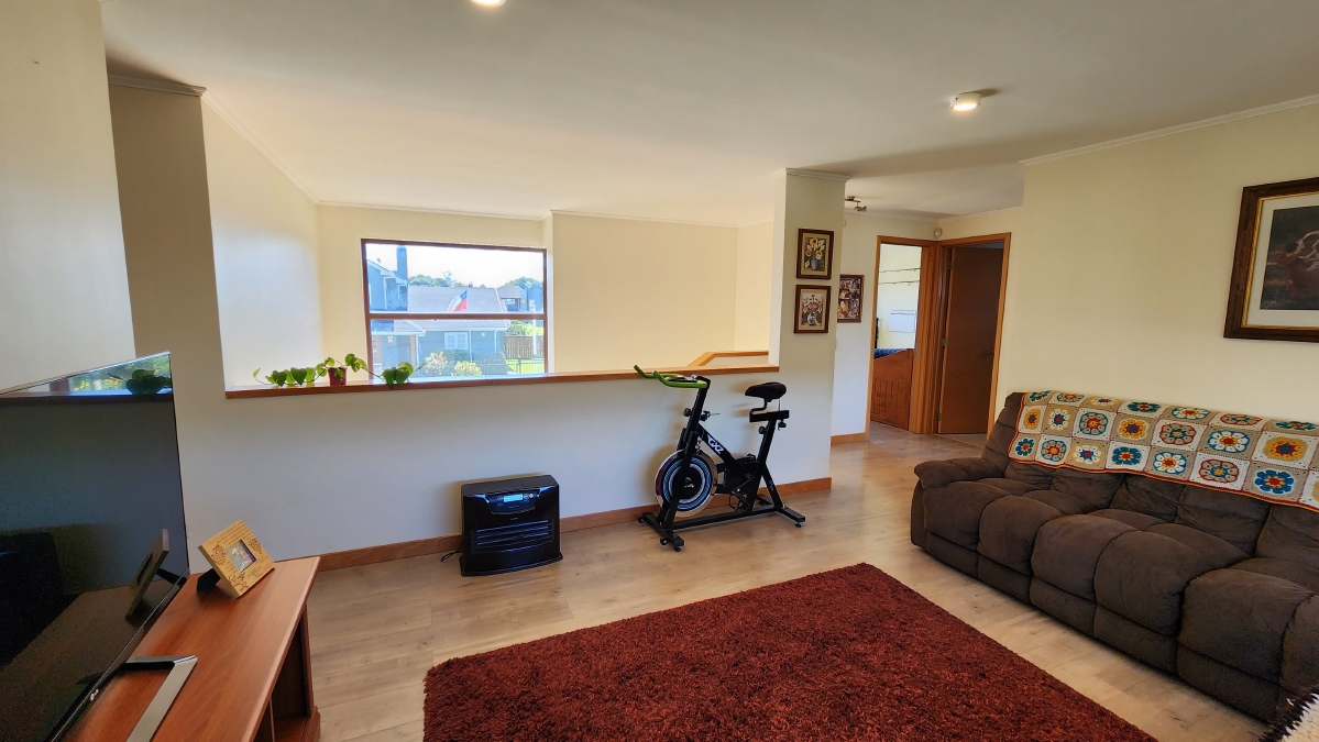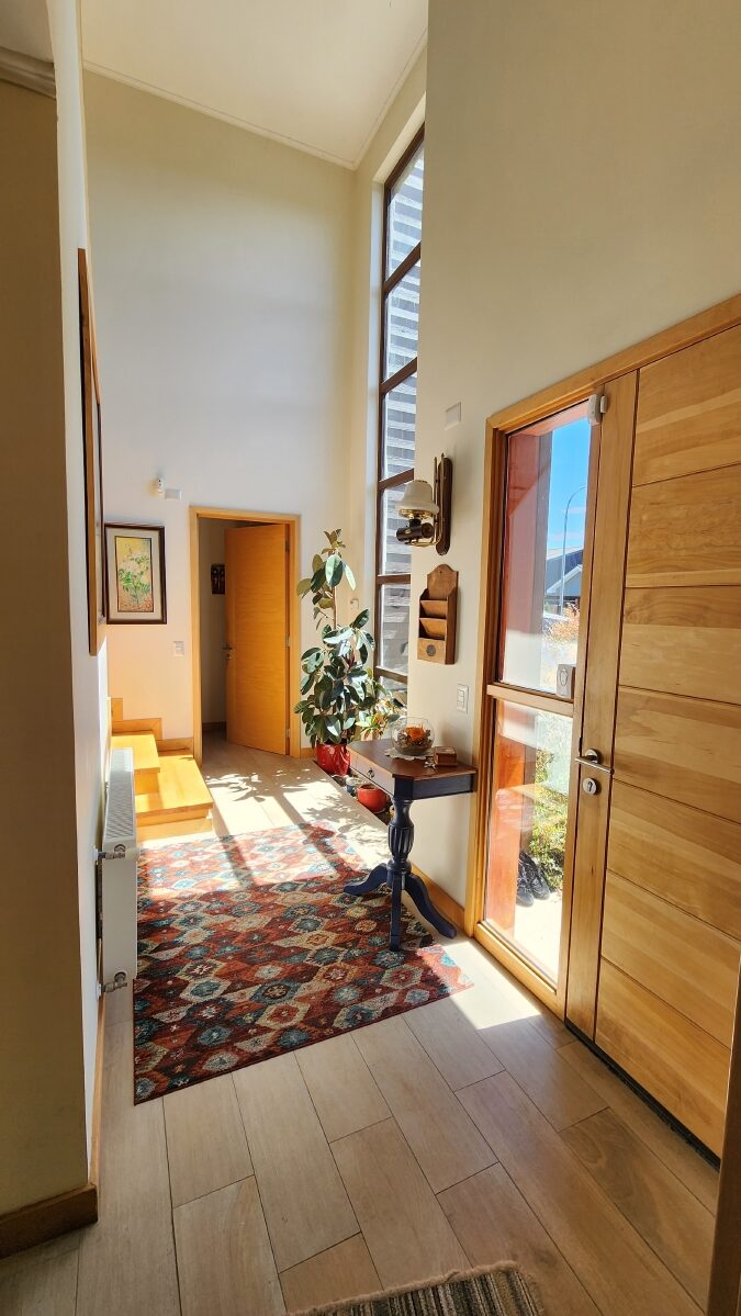 Escalera de mañío, que llega a una gran sala de estar, que distribuye a dos alas con 4 dormitorios y dos baños.