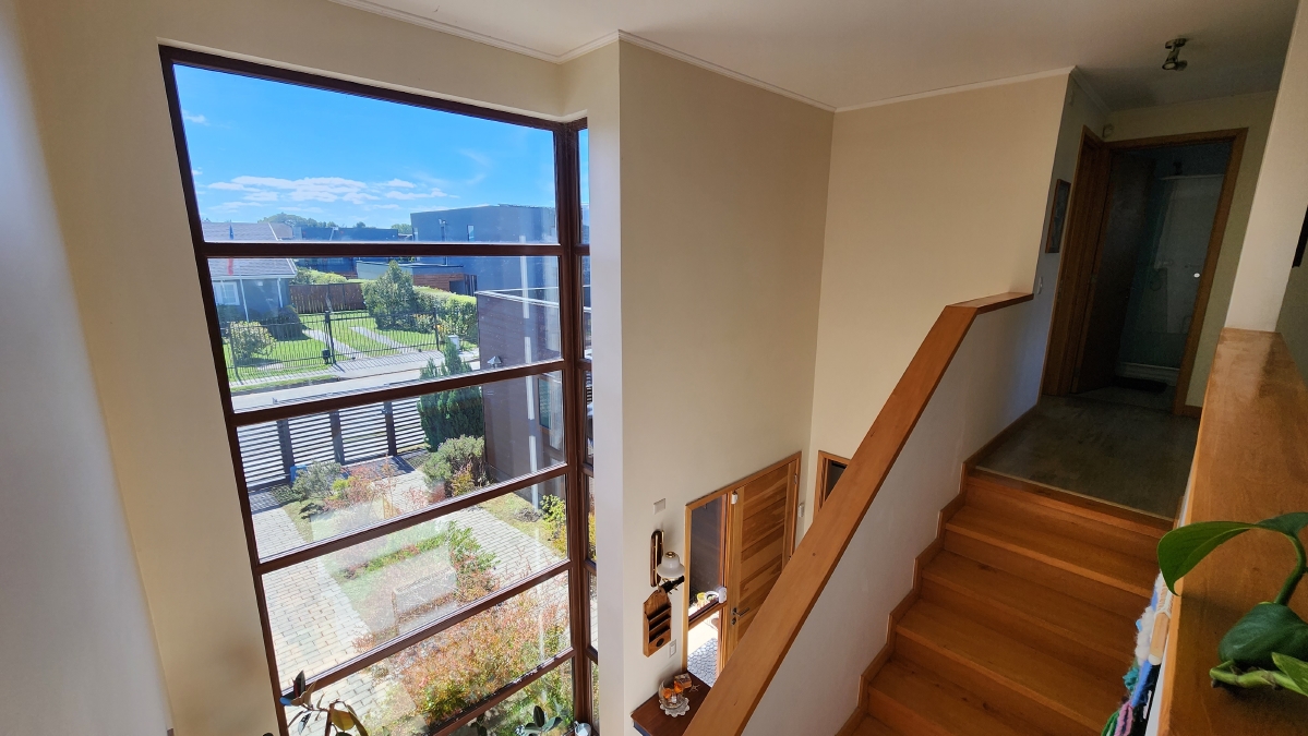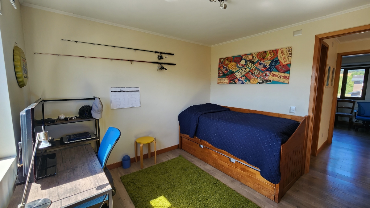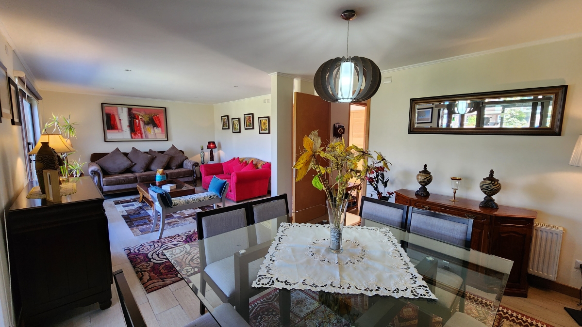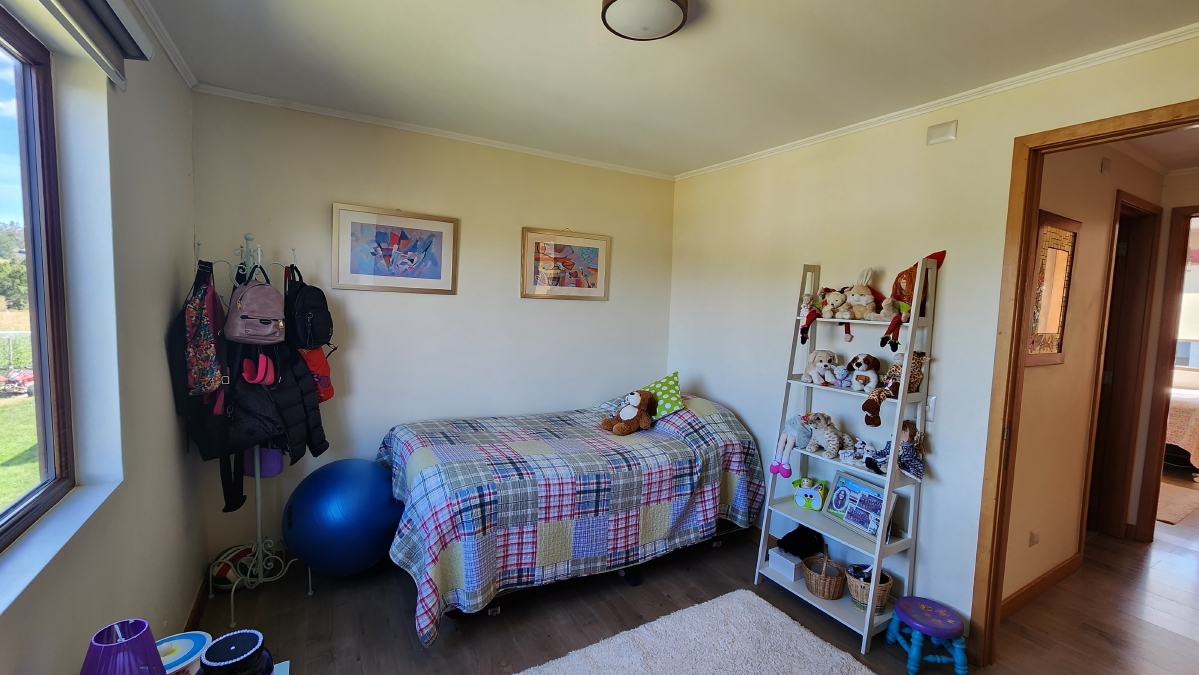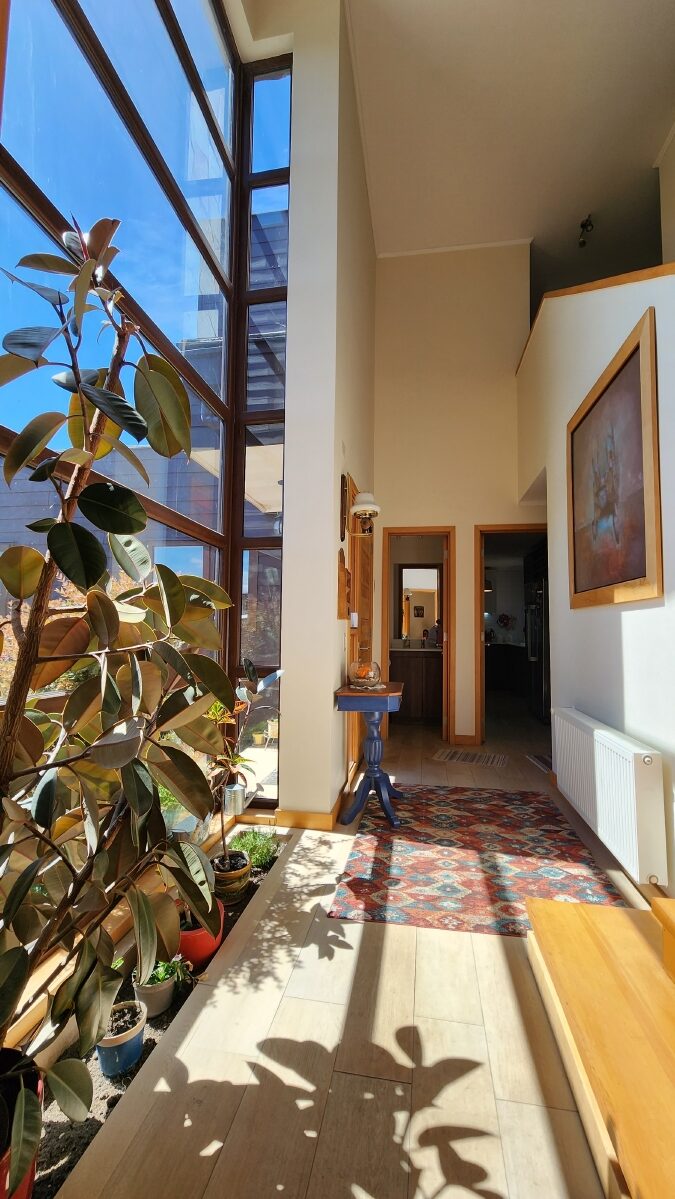 Escalera de mañío, que llega a una gran sala de estar, que distribuye a dos alas con 4 dormitorios y dos baños.