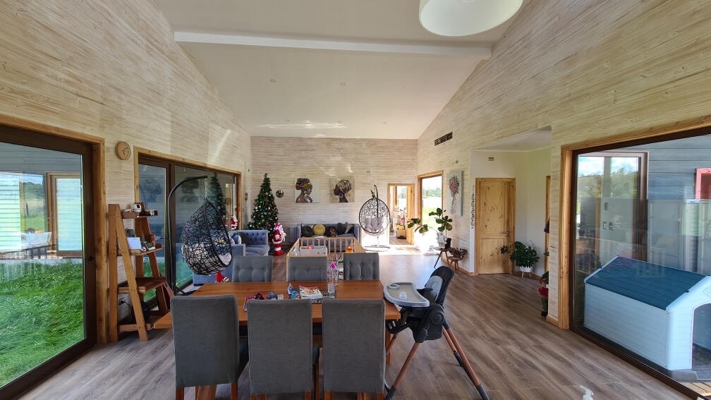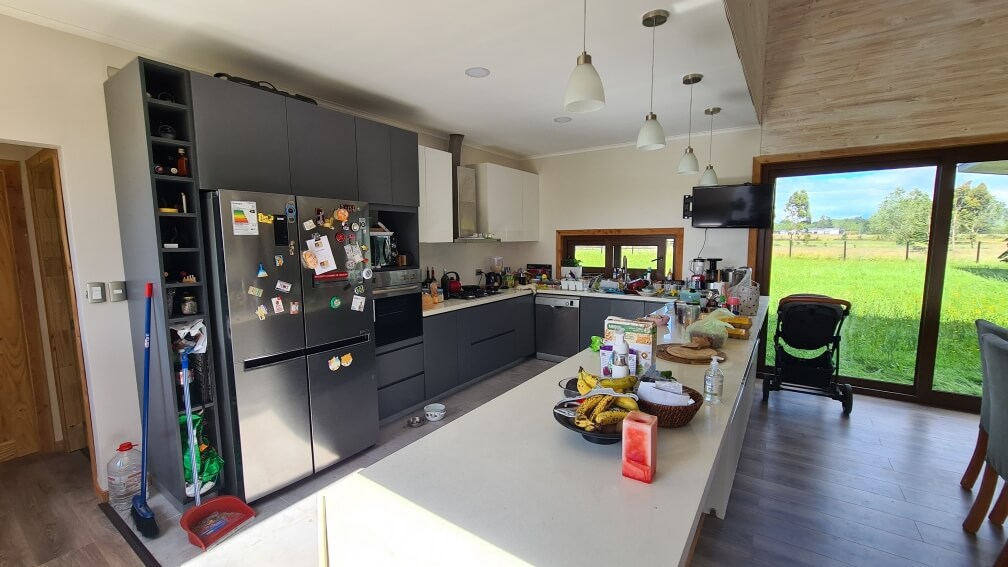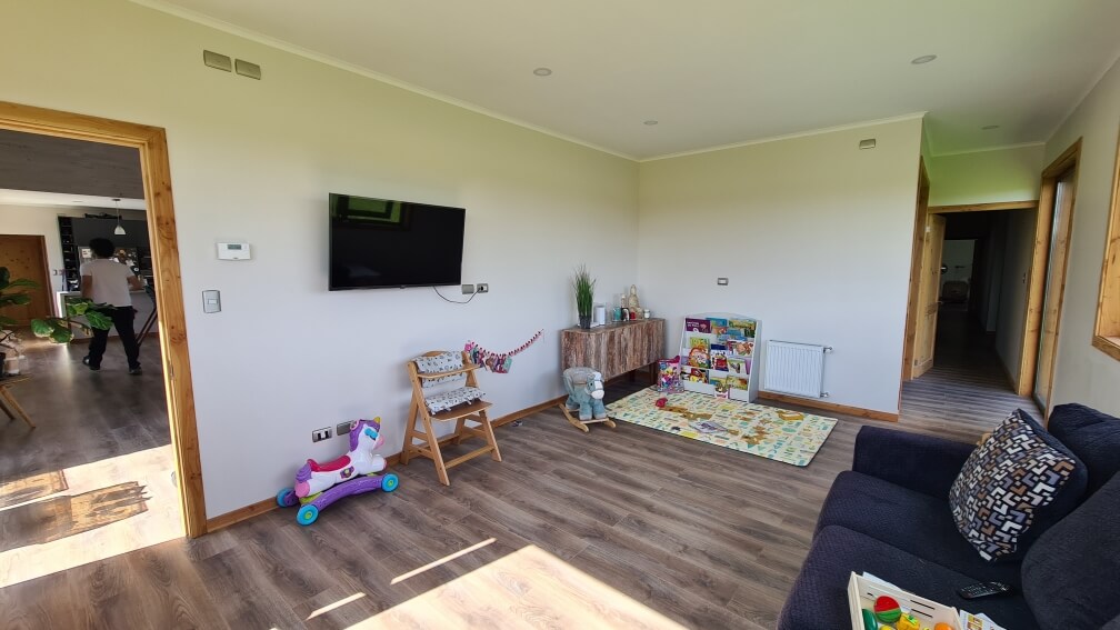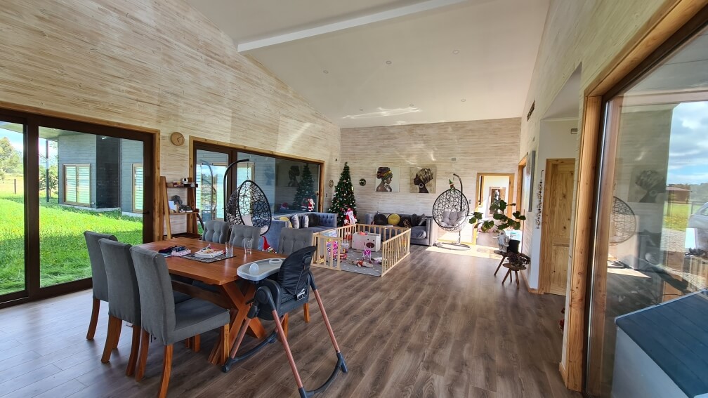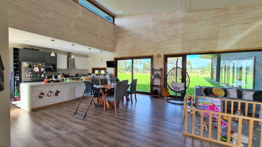 Cuenta con termopanel en todas las ventanas con folio de madera, excelente aislación térmica tipo celulosa, calefacción central con caldera a Pellet. Vista despejada al norte, contemplando los bellos campos del sur y privilegiando el asoleamiento.