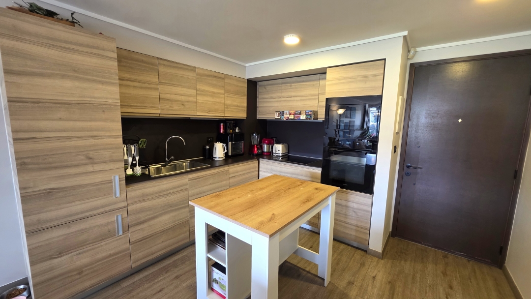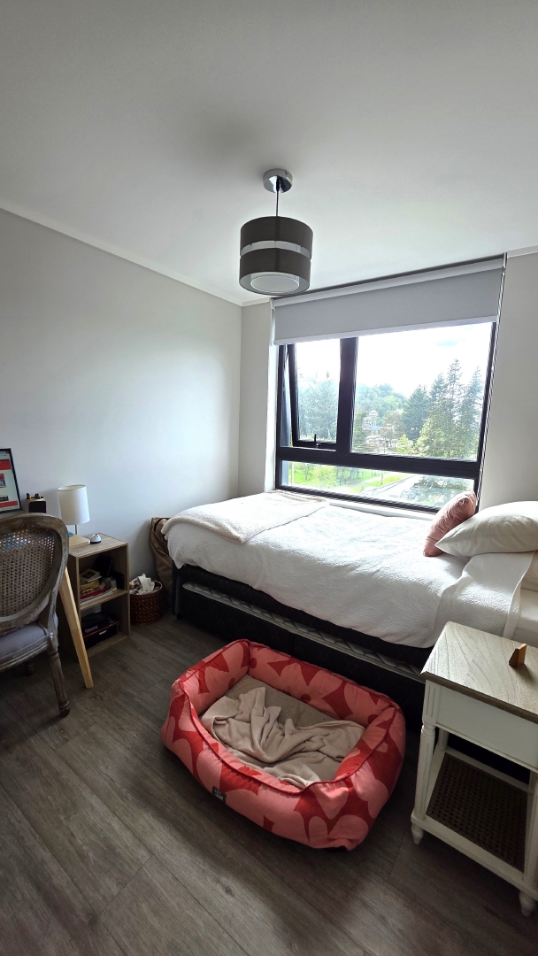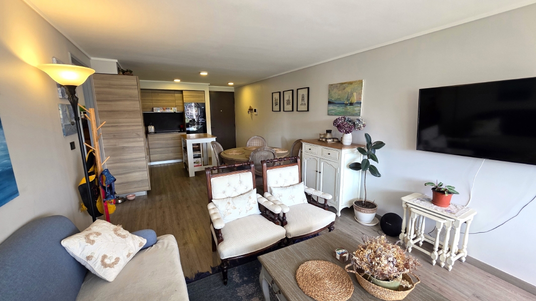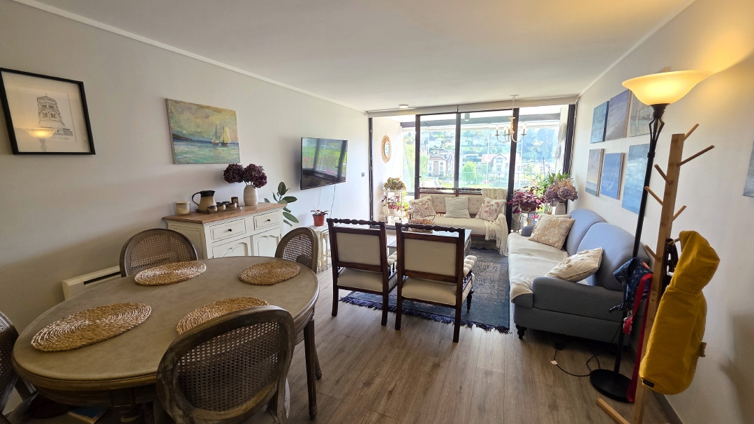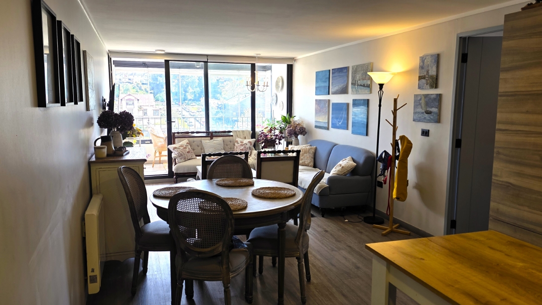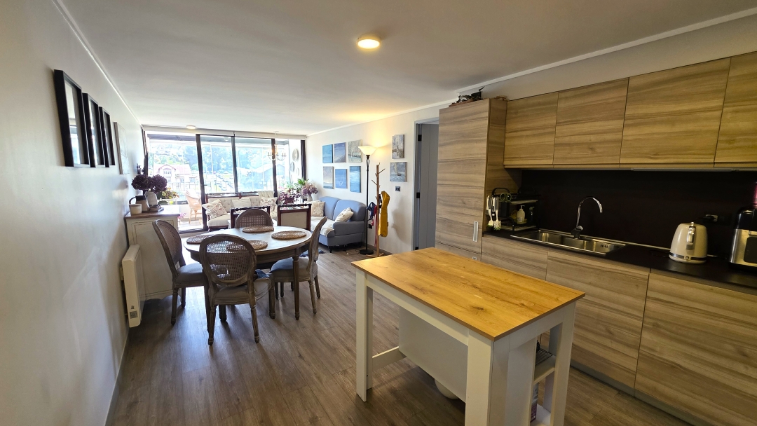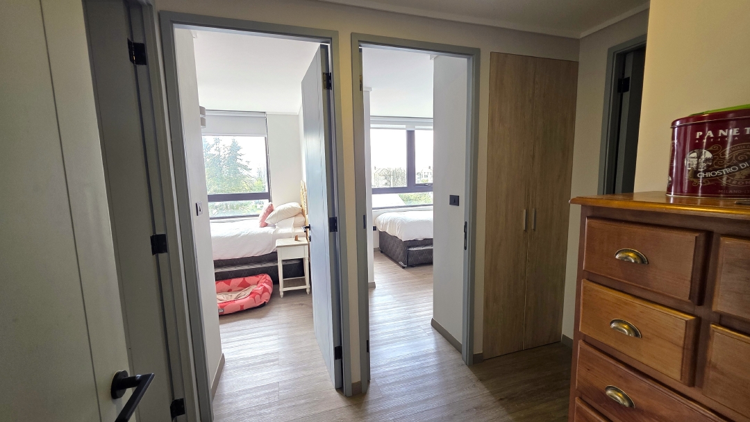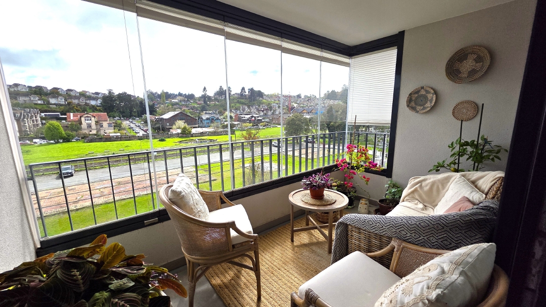 Departamento en quinto piso con orientación norponiente, en excelentes condiciones como nuevo, cuenta con una cómoda distribución, ya que comprende un ala pública y otra privada completamente separadas. Acceso con living y comedor, salida a la terraza cerrada con vista panorámica, moderna cocina incorporada con isla y completamente equipada con refrigerador incorporado, encimera, horno, MMOO, lavavajillas todo marca Miele. En la zona privada, un amplio dormitorio principal en suite con un buen closet, otros 2 dormitorios con vista al lago y volcanes, que comparten un baño completo, área de despensa y logia con la lavadora secadora Miele.