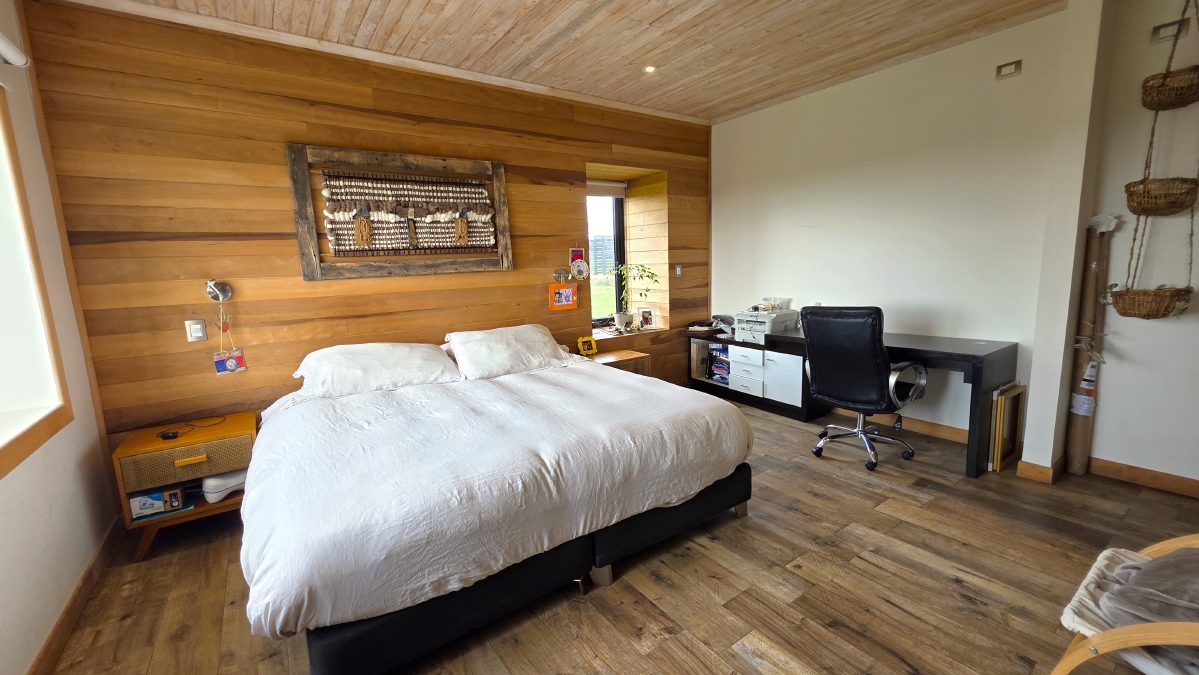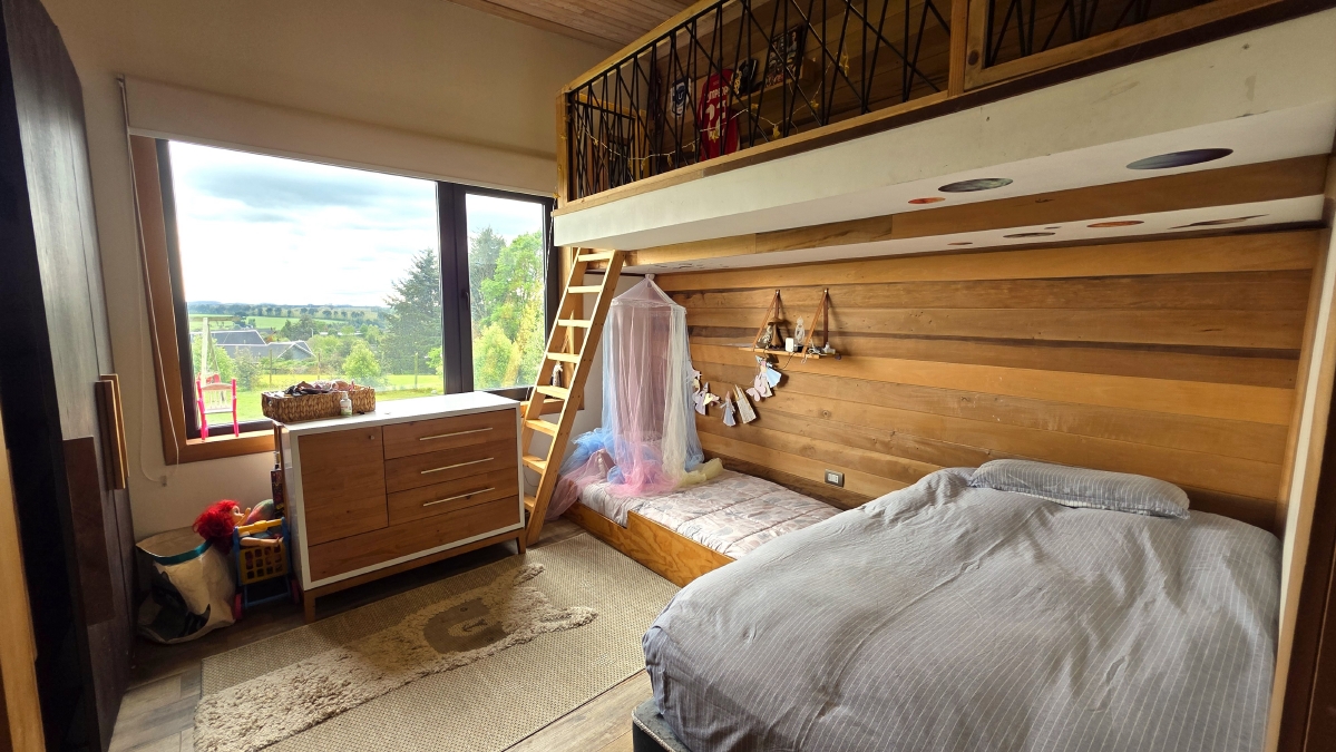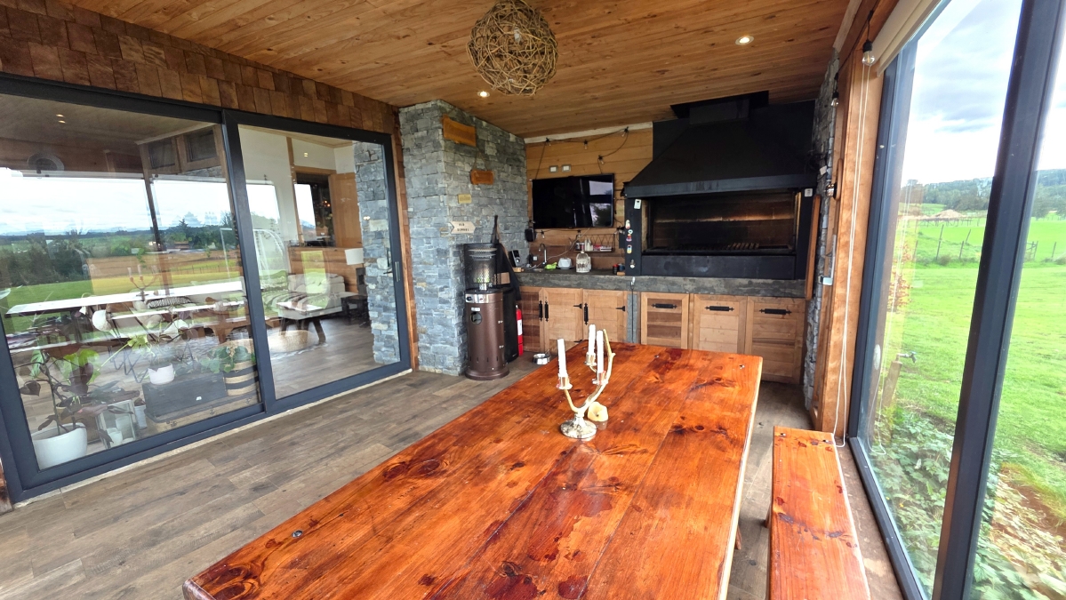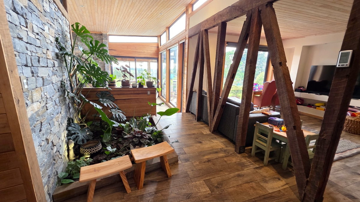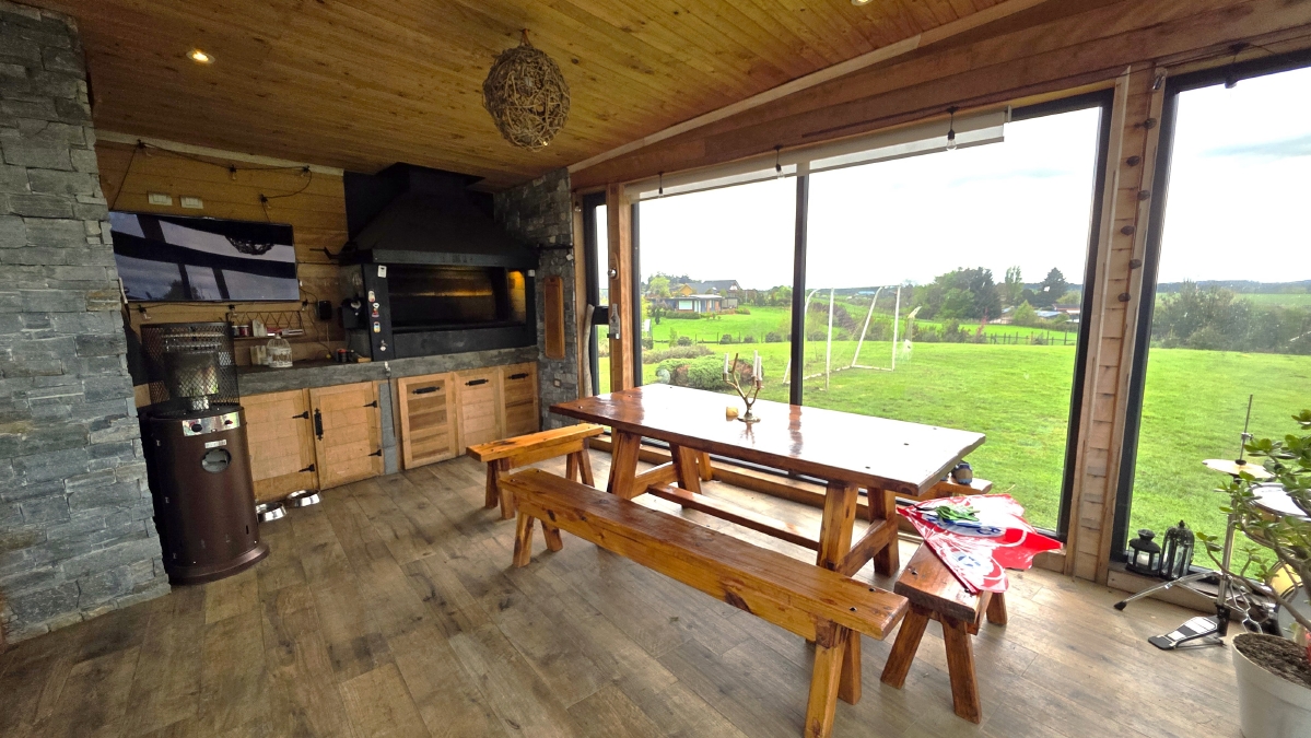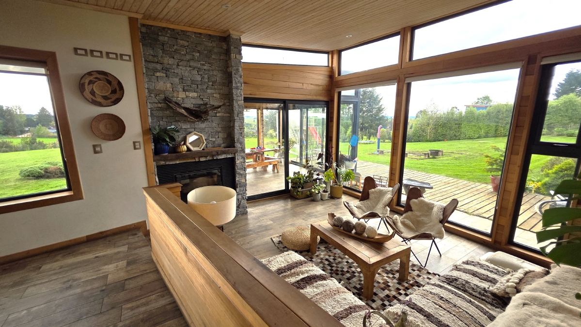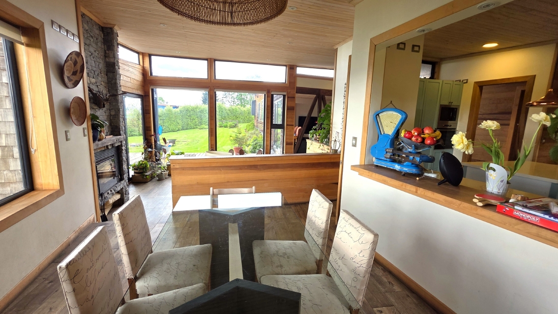 Cuenta con termopanel en todas las ventanas, calefacción central con losa radiante en todos los recintos, con bomba de calor y/o caldera a gas, bodega, gallinero, área de juegos, portón corredero; Esta casa cuenta con un gran trabajo de maderas recicladas, en su mayoría laurel, además posee terminaciones de primera calidad en baños, cocina y pavimentos interiores. Sistema constructivo innovador que crea una excelente envolvente térmica, sumado al revestimiento exterior de tejuela y zinc prepintado que no requieren mantención.